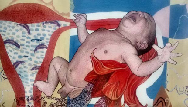 Otras dos piezas relacionadas a la gestación llaman la atención en el conjunto: Mamafrida (mixta/lienzo) y Mama Marilyn (acrílico sobre lienzo) de Juan Alfonso Tamayo. En ambas el dibujo –la limpieza del trazo, la similitud con los personajes retratados, el desnudo de los cuerpos– juega un papel fundamental: Frida Kahlo parece interrogarnos desde un embarazo que no pudo ser; es una piel morena, americana, un embarazo feliz, natural, el que Tamayo ha querido otorgarle a la artista mexicana que –precisamente a causa de una maternidad inexistente o al menos no concretada– representó el tema como sinónimo de dolor, sufrimiento, en muchos de sus cuadros. En cambio Marilyn Monroe es pura sensualidad en estado de gestación: es como si posara sonriente a la cámara fotográfica (o incluso de televisión) orgullosa de ser uno de los símbolos sexuales más populares de todos los tiempos; además la perfecta estilización de sus senos concuerda con la forma puntiaguda de un embarazo que tampoco se concretó.