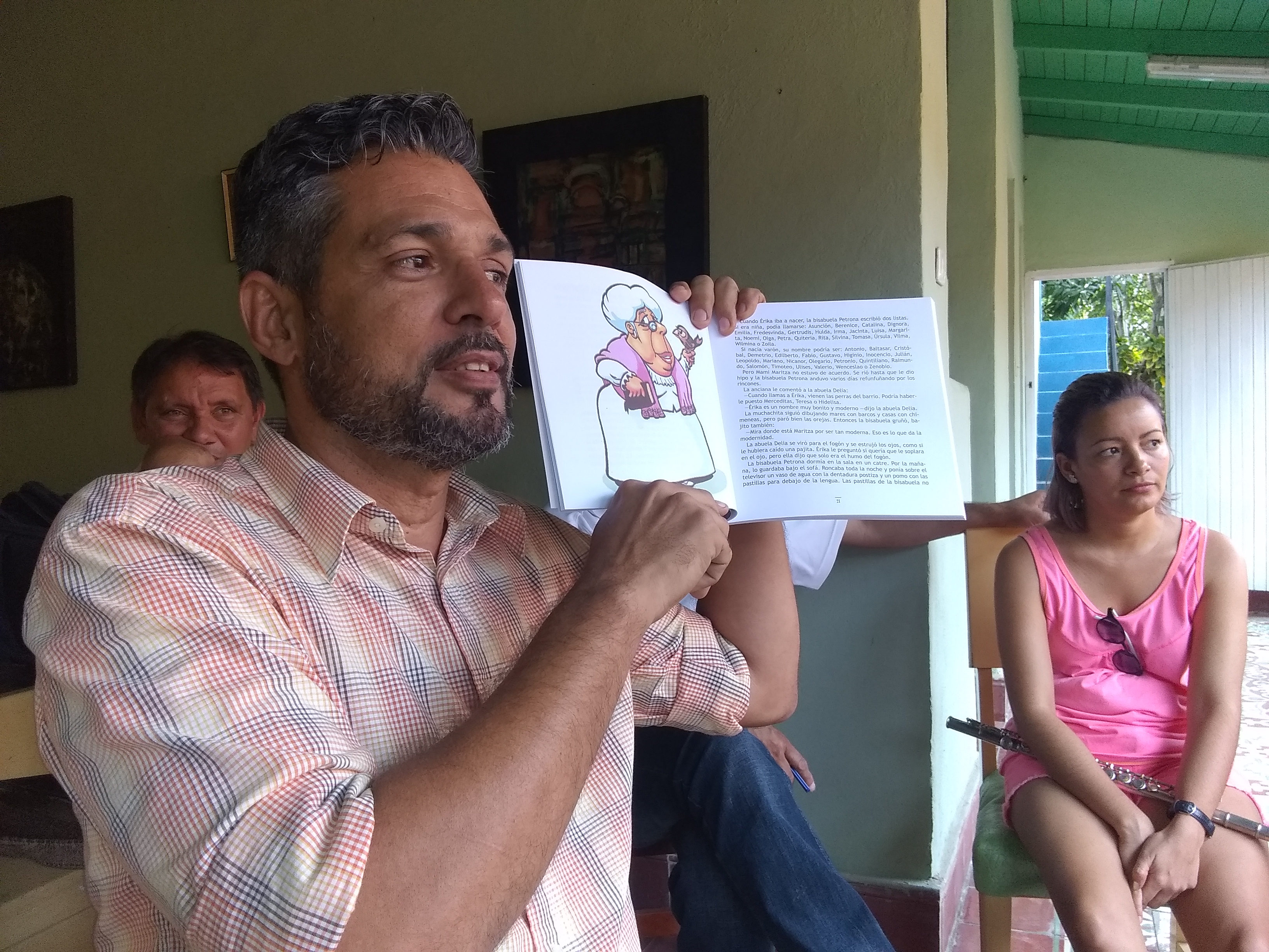 Rubén les va presentando a los niños los personajes, como la bisabuela en extremo optimista que dice que en un ciclón no va a llover o la abuela llorona que no deja de escuchar novelas de radio o las cosas de mami Maritza y las travesuras de su hija Érika.
