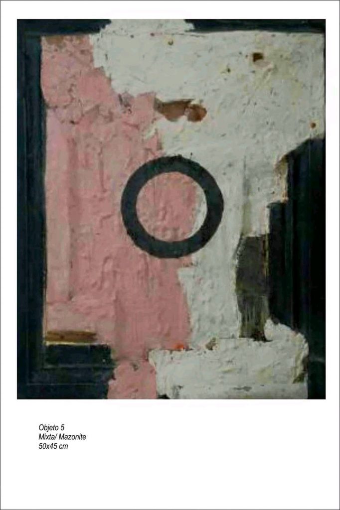 “La acumulación de empastes extra pictóricos que le confieren densidades inusuales a la pintura, el aplique de incisiones en la materia, empleando como soportes el collague y el chorreado, la presencia muy diversa de objetos extra artísticos como tapas de lata, maderas viejas, bisagras, chatarras, hacen que estas obras muestren una fuerte carga expresiva. Creándose formas indefinidas o simplemente evocadoras. Dentro de este caos aparente se distingue la figura geométrica del círculo, que prevalece como referencia instauradora de equilibrios”, leemos en las palabras de catálogo de la muestra, con curaduría de Bertha Beltrán y dirección general de Yuricel Moreno Zaldívar.